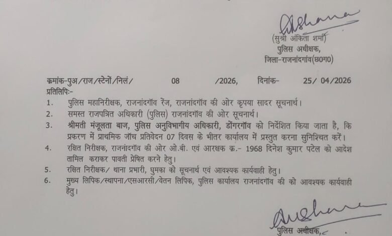 तत्काल प्रभाव से आरक्षक को निलंबित कर रक्षित केंद्र राजनांदगांव में अटैच कर दिया आदेश में स्पष्ट किया गया है कि संबंधित आरक्षक बिना अनुमति से मुख्यालय नहीं छोड़ सकेंगा और उसे नियमानुसार हाजिरी देनी होगी मामले की गंभीरता को देखते हुए एस डी ओ पी डोगरगांव को 7 दिनों के भीतर प्राथमिक जांच रिपोर्ट प्रस्तुत करने का निर्देश दिया गया है। साथ ही संबंधित अधिकारियों को आवश्यक कार्यवाही सुनिश्चित करने का निर्देश भी जारी किया गया है