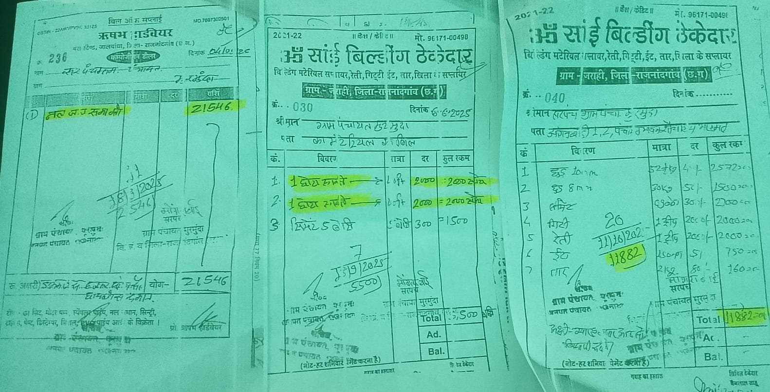 1)छोटा हाथी 40 फीट का ₹2000 का दो , 2) नल जल सामग्री 21546 व 3) बे हिसाब बिल। भगवान भरोसे सचिव का काम ग्राम पंचायत के सचिव बिल को पास किया है लेकिन खुद को पता नहीं कौन सा सामग्री आया है और किस सामग्री का बिल लगाया है कितने का बिल लगा है कम का है या ज्यादा का है
